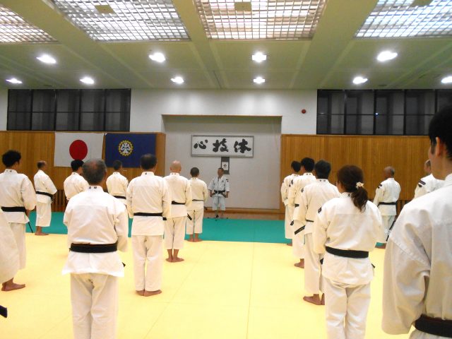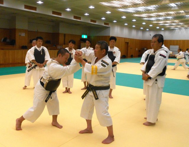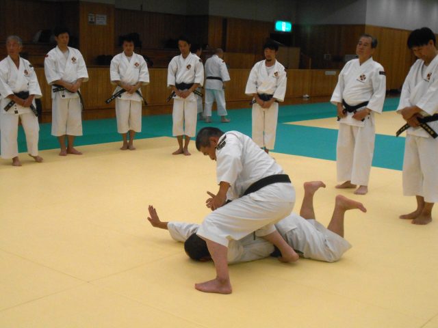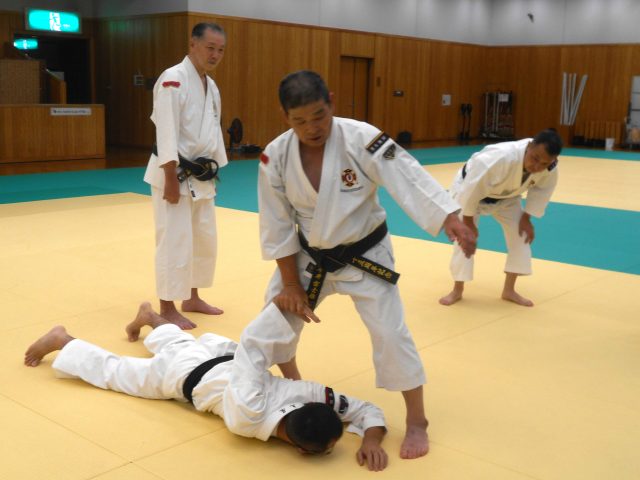 準備運動をして、中観攻防の基本(胴を使用で複数の人を蹴る)、昼休み、実技Ⅰへと進む。小手投げの掛手の指導をしているところ。