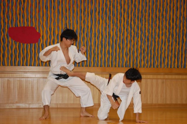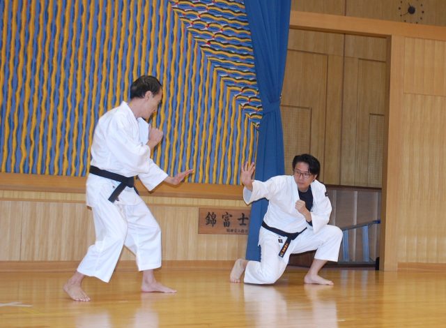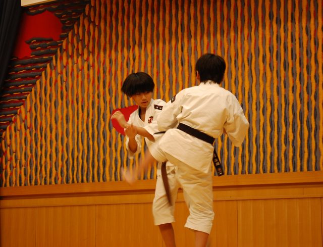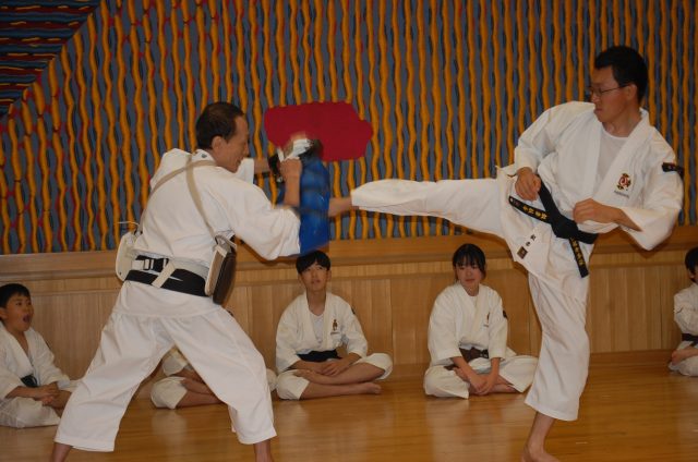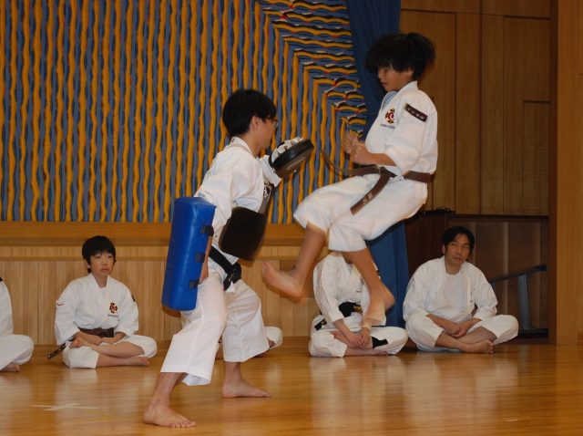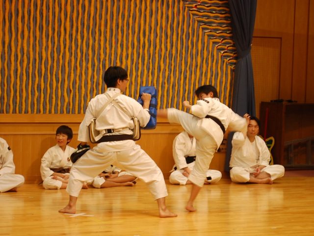 次は防具へ突き蹴りを当てる稽古です。胴を蹴るいい音が会場に鳴り響きました。