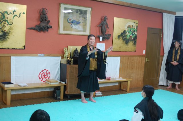 開祖 宗 道臣の「人の犠牲をもって幸せになることを求めない」という考えや力愛不二の生き方を、世界で起きている出来事と照らし合わせ、金剛禅が目指している道についてのお話をしてくださいました。