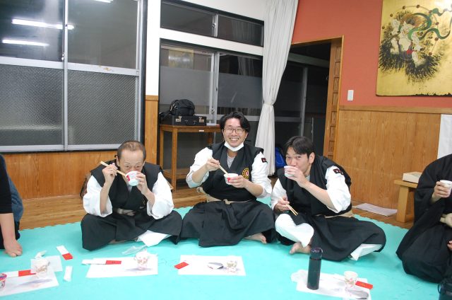 新春法会が終わったら会食をします。皆で円を作りお汁粉などを美味しくいただきました。