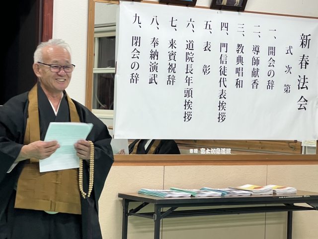 | 2026.01.07 静岡登呂道院 新春法会を開く 一月六日(火)新春法会を行いました。M副道院長の司会で導師献香、教典唱和と進み、門信徒代表挨拶は、O助教が今年を務めました。「今年は、正拳士を目指して精進します... | |