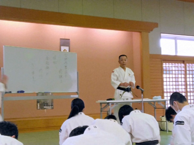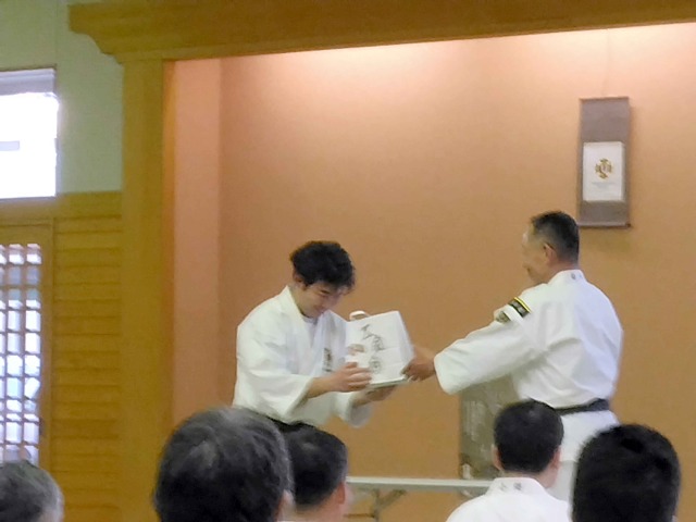 菊池 教師の「道院長になりたい人はいますか?」の問いに、一番先に手を挙げた三方ヶ原道院の森上拳士が、菊池 教師よりお菓子を頂きました。